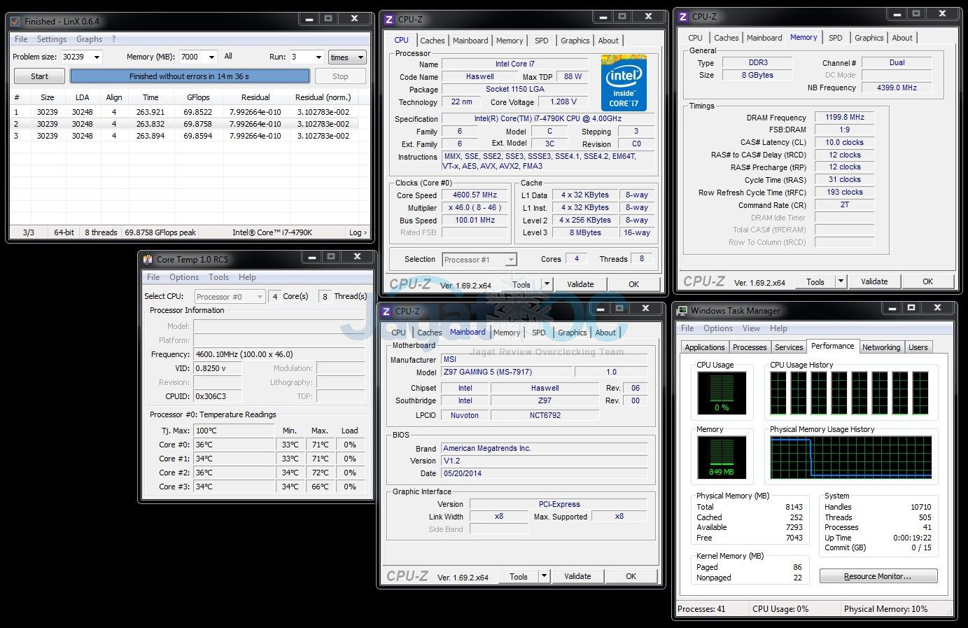 Suhu maksimum saat LinX di 4.6Ghz 1.2V tercatat pada 71-72 C. Sebagai perbandingan, Suhu Core i7-4770K kami yang menjalani LinX di setting yang sama ada di 73-74 C. Ini berarti pada VCore yang rendah seperti 1.2V, perbaikan TIM(thermal interface material) pada Devil’s Canyon 4790K belum terlalu terasa. Mungkin manfaat TIM yang diperbaiki ini baru terasa saat kami menggunakan VCore besar seperti 1.3 – 1.35V.