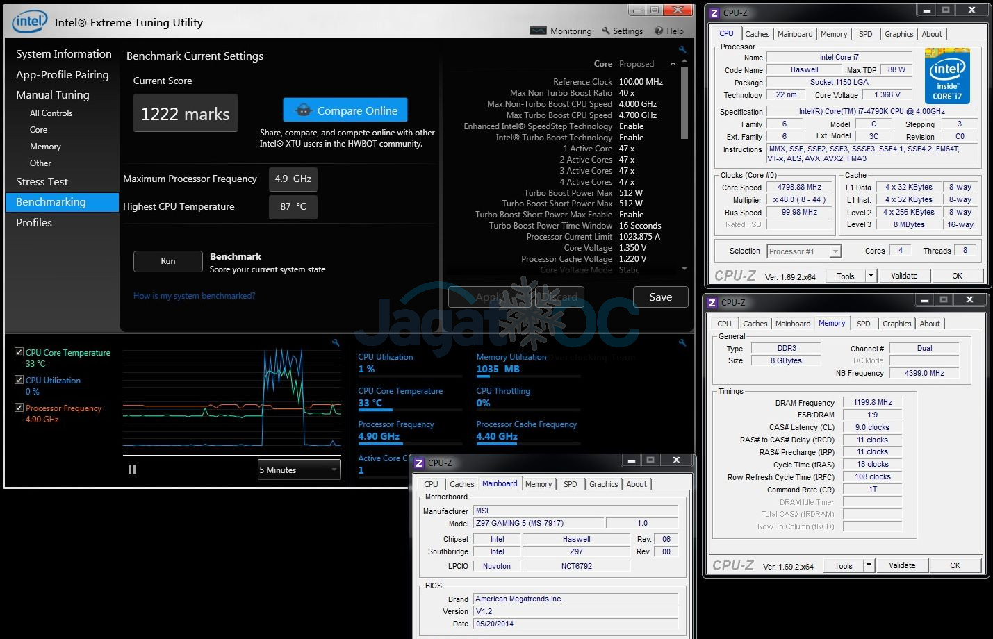 Dengan setting VCore 1.35V, 4790K kami bisa melewati pengujian Cinebench R11.5 dan Intel XTU benchmark pada clock 4.8Ghz. Disini, clock 4.8Ghz bukan sesuatu yang spesial, karena kami juga pernah memiliki Core i7-4770K yang bisa mencapai clock serupa dengan setting sama, hanya saja suhu operasi Core i7-4790K terlihat jauh lebih rendah. Kebanyakan Core i7-4770K kami bisa menggunakan clock 4.8Ghz pada Cinebench R11.5 namun suhu maksimalnya akan tembus 83-84 C-an(pada pendingin dan setting sama). Sedangkan 4790K kami bertahan pada 75-76 C. Deteksi suhu pada benchmark XTU menunjukkan hal serupa, jarang ada Core i7-4770K yang bisa menjalankan XTU di 4.8Ghz 1.35V tanpa menyentuh suhu 90C-an lebih, sedangkan 4790K kami bertahan pada 87 C.