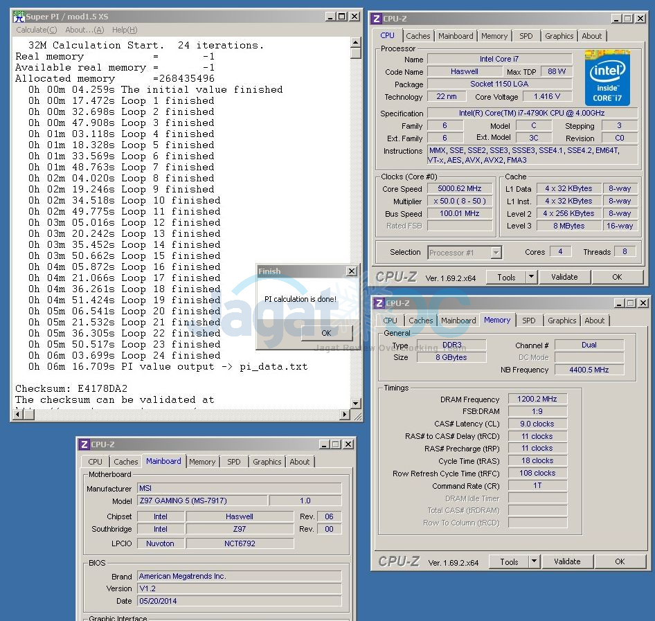 Pada VCore 1.4V, prosesor kami bisa menjalankan benchmark single-threaded SuperPI 32M pada clock 5 Ghz (Semua Core dan Hyper-Threading masih aktif) Sekali lagi, pencapaian ini bukan hasil yang istimewa. Kami sudah pernah melihat ada Core i7-4770K yang bisa menjalankan SuperPI 32M 5 Ghz pada VCore yang sama atau bahkan lebih rendah. Catatan: skor SuperPI 32M diatas tidak terlalu optimal karena dijalankan di OS Windows 7, dan juga dijalankan di memori yang tidak terlalu kencang (hanya DDR3-2400CL9).