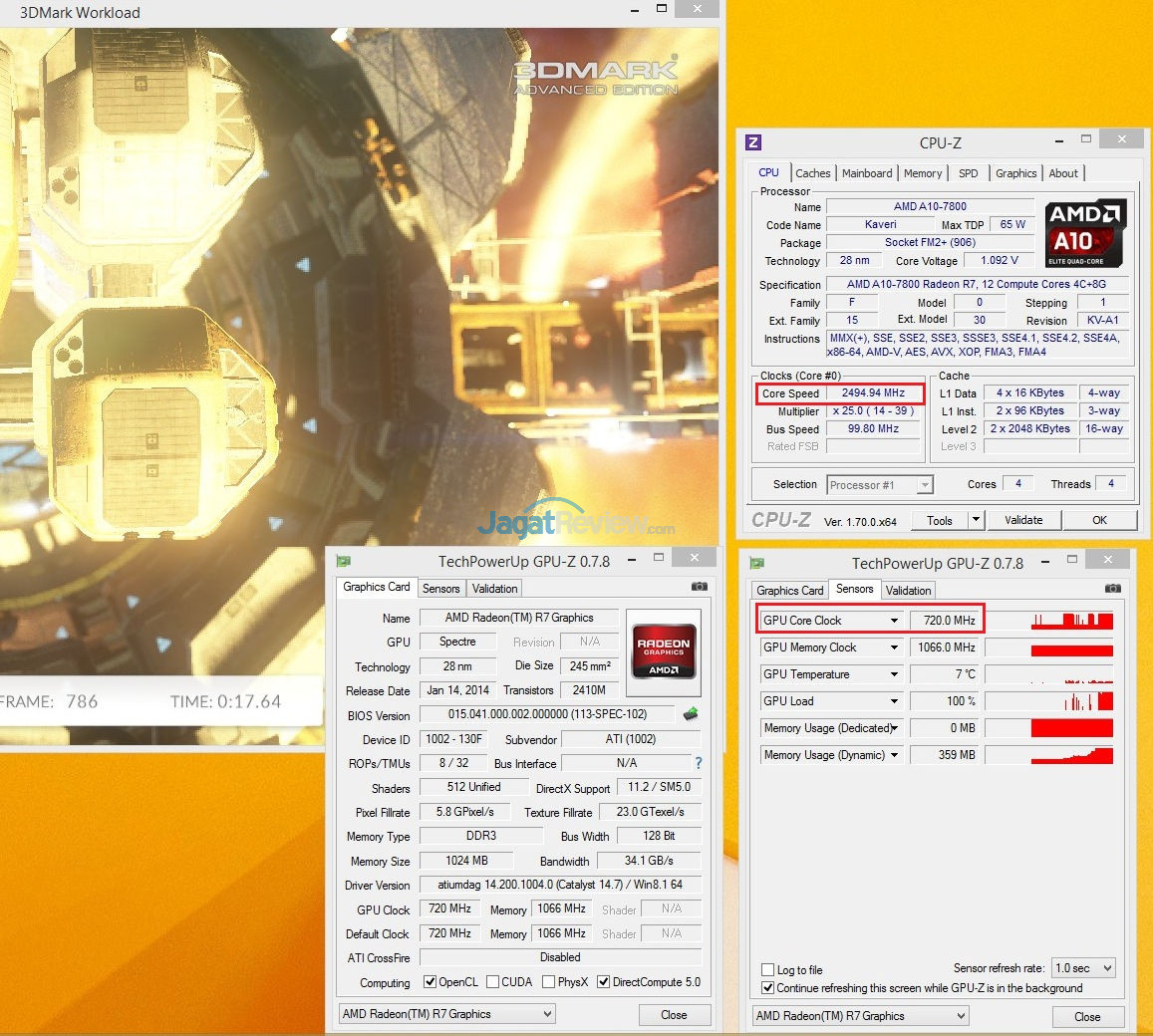 Sama seperti prosesor AMD Kaveri A10-7850K, AMD APU A10-7800 mengubah-ubah clock CPU-nya untuk menyesuaikan dengan load yang ada. Pada Keadaan idle prosesor menurunkan clock-nya menjadi 1.4Ghz, lalu saat loading aplikasi single threaded, dia berubah menjadi 3.9Ghz. Pada Aplikasi yang membutuhkan keempat CPU Core untuk di-load bersamaan, A10-7800 akan memasang clock 3.6Ghz s/d 3.8Ghz. Yang terakhir, saat GPU terintegrasi di-load dengan game maupun aplikasi benchmark, kecepatan prosesor akan diturunkan ke 2.5Ghz. Sejauh yang kami lihat, GPU Clock selalu berada pada 720Mhz pada aplikasi 3D, tidak pernah turun.