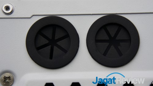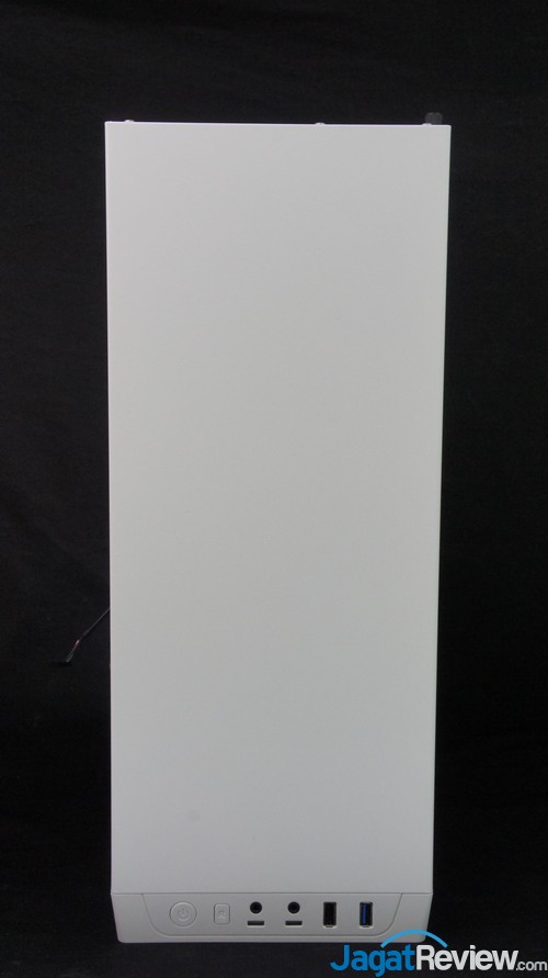 Di front panel, selain tombol power dan reset, terdapat satu port USB 2.0 dan satu port USB 3.0, BitFenix cukup jeli menempatkan kedua port USB tersebut sehingga memungkinkan penggunaan dua USB stick secara bersamaan. Terdapat juga dua port audio di antara tombol reset dan port USB. Di sini, kami sedikit bingung membedakan kedua port audio yang ada karena tidak ada indikator maupun kode warna untuk kedua port audio tersebut. Biasanya port Audio In dilambangkan dengan warna hijau dan Audio Out dengan warna merah/pink.