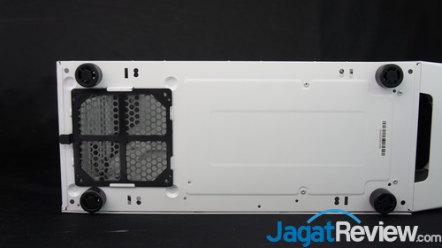 Beralih ke bagian bawah, BitFenix menyediakan empat kaki dari bahan karet untuk menopang casing ini. Selain itu, terdapat juga dust filter untuk PSU.