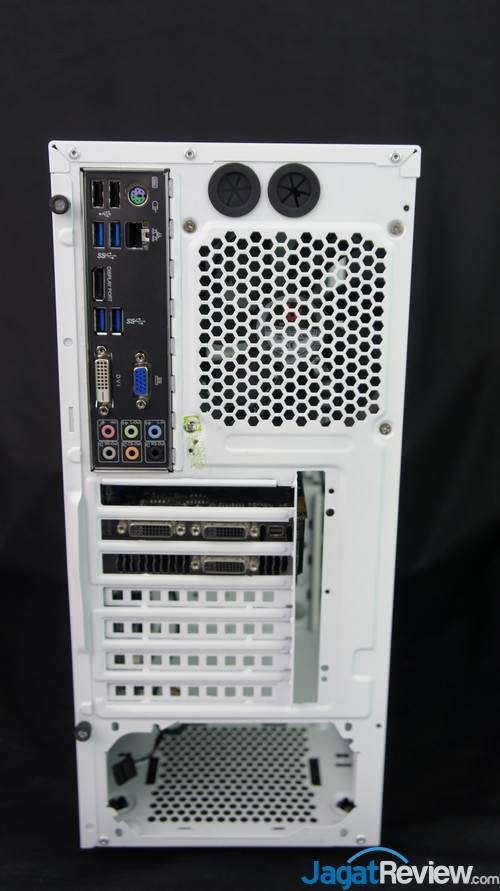 Di bagian belakang, terlihat 7 buah slot PCI-E yang siap mengakomodasi penggunaan hingga 3 graphics card. Seperti layaknya kebanyakan casing middle tower keluaran baru, BitFenix menempatkan PSU untuk casing ini di bagian bawah. Terdapat juga tempat untuk memasang fan berukuran 12 cm yang juga dapat digunakan untuk memasang watercooling dengan radiator 12 cm.