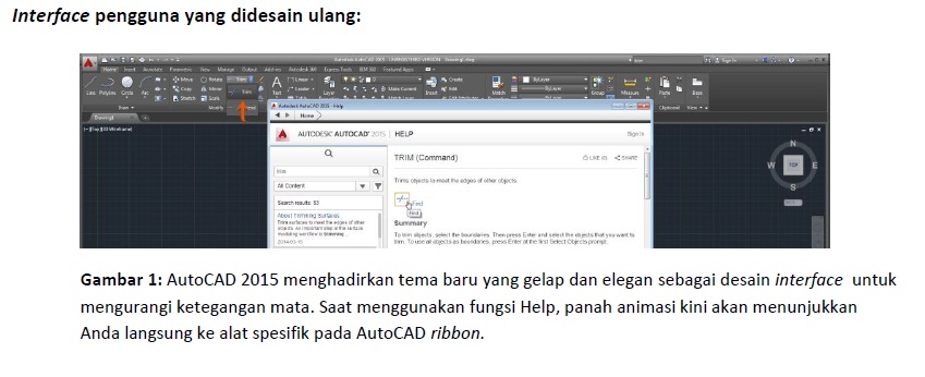 Interface Pengguna yang Didesain Ulang: Cohn menyadari perubahan yang sangat signifikan pada interface AutoCAD. Help System, menu untuk mendapatkan informasi bagaimana menggunakan fitur baru, kini dilengkapi dengan cara baru untuk membantu pengguna menemukan alat yang relevan dengan interface AutoCAD. Program ini juga didukung oleh interface modern berwana gelap yang diyakini dapat mengurangi ketegangan pada mata. Pengguna juga dapat mengubahnya ke dalam tampilan tradisional jika memang mereka lebih menyukainya. Sementara itu, Status Bar tidak hanya menampilkan alat yang paling sering digunakan, tetapi juga dapat disesuaikan menggunakan fitur untuk kustomisasi.