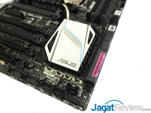 Heatsink chipset pada motherboard tersebut juga menarik dengan balutan warna putih dengan garis biru dan abu abu.