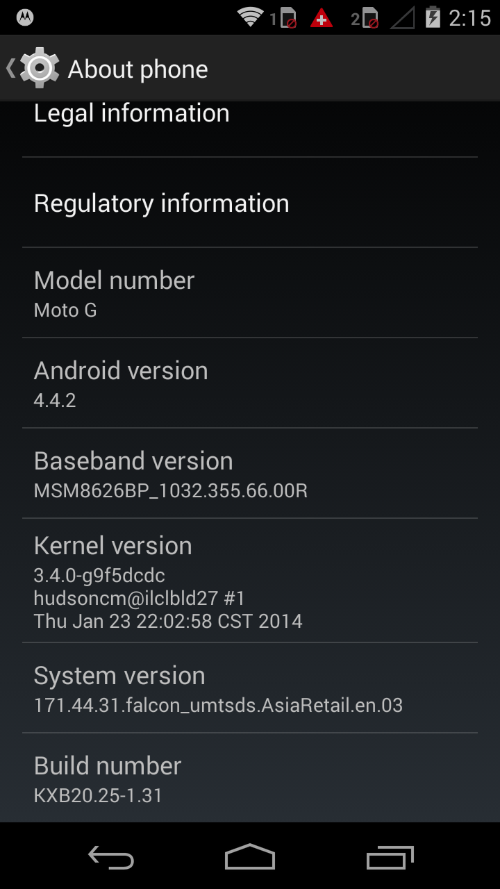 Motorola menjamin bahwa mereka memiliki sistem operasi Android yang paling baru pada produk yang satu ini. Oleh karena itu, pada saat pengujian sistem operasinya sudah menggunakan Kitkat 4.4.2. Sayang memang, di Indonesia belum mendapatkan KitKat 4.4.4 sampai pengujian berakhir. Walaupun begitu, pengguna di luar region Indonesia telah mendapatkan KitKat terbaru tersebut. Belum lagi, Motorola menjanjikan Android L pada smartphone yang satu ini.