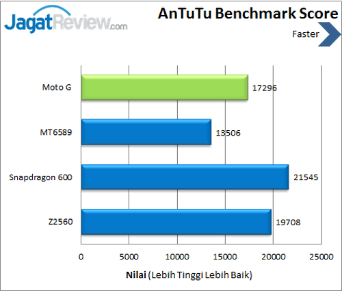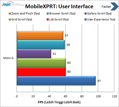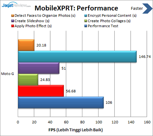 Kami pun menggunakan Battery XPRT untuk melakukan pengujian baterai pada smartphone yang satu ini. Hasilnya adalah Moto G mampu bertahan selama 16,9 jam atau sekitar 16 jam 54 menit. Hasil seperti ini membuat Moto G mampu digunakan selama seharian dalam pemakaian standar.