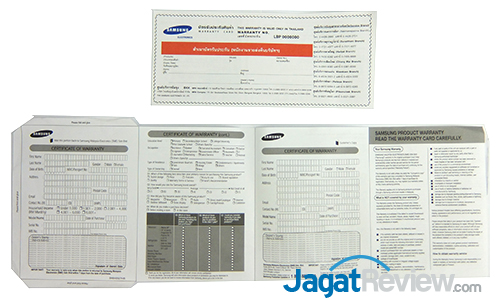 Untuk kelengkapan paket penjualan, Samsung juga turut menyediakan dua buah kabel listrik beserta kabel USB, juga kartu petunjuk penggunaan serta kartu garansi resmi.