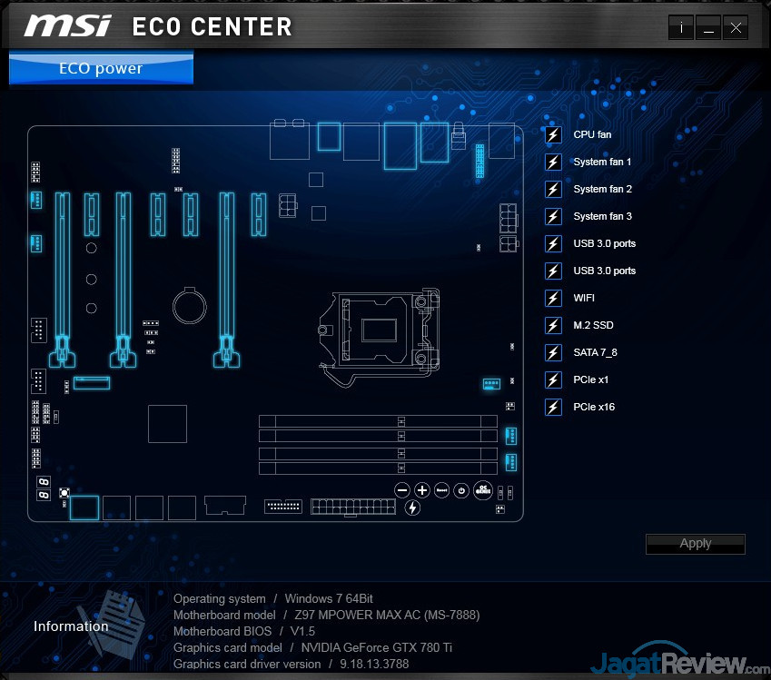 ECO Center dapat mematikan beberapa komponen sistem yang tidak anda butuhkan, untuk sedikit menghemat energi.