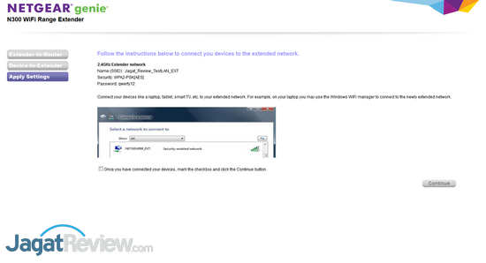 Setelah kami bisa mengakses tool manajemen untuk WN3000RP, tool tersebut langsung menampilkan wizard untuk memandu pengguna menghubungkan perangkat tersebut ke WiFi yang ada di sekitarnya. Pengguna bisa menentukan apakah jaringan wireless network perluasan akan menggunakan SSID dan security yang sama dengan jaringan utamanya atau menggunakan konfigurasi tersendiri. Setelah seluruh pengaturan selesai dilakukan, perangkat akan menyiapkan diri dan setelah beberapa saat perangkat bisa digunakan.