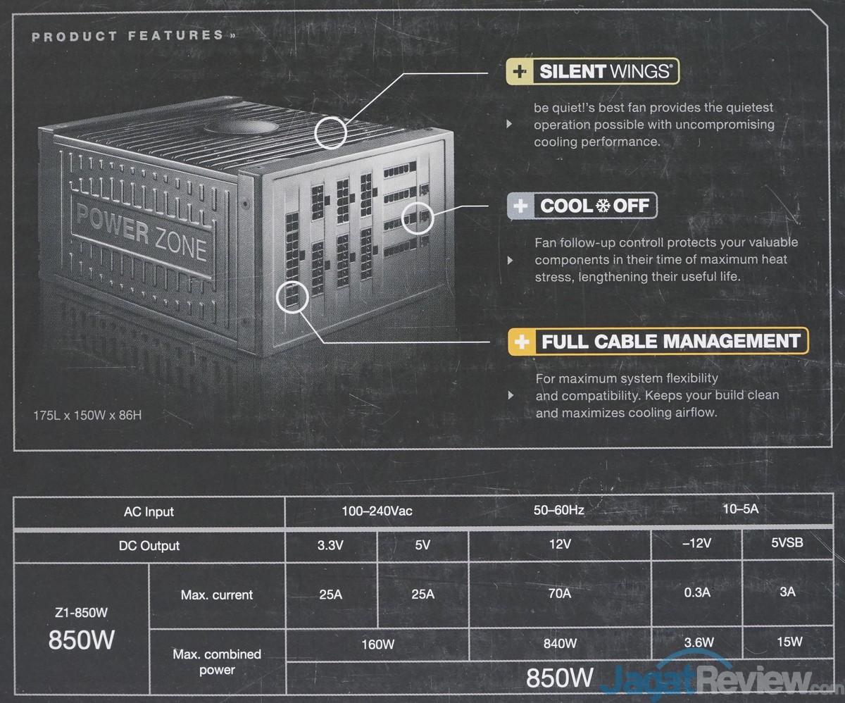 Spesifikasi singkat dari PSU BeQuiet! 850 watt. PSU ini menggunakan sistem single rail 12V+ dengan spesifikasi yang mampu menyuplai arus listrik hingga mencapai 70A. PSU ini juga sudah mendapat sertifikasi 80+ Bronze.