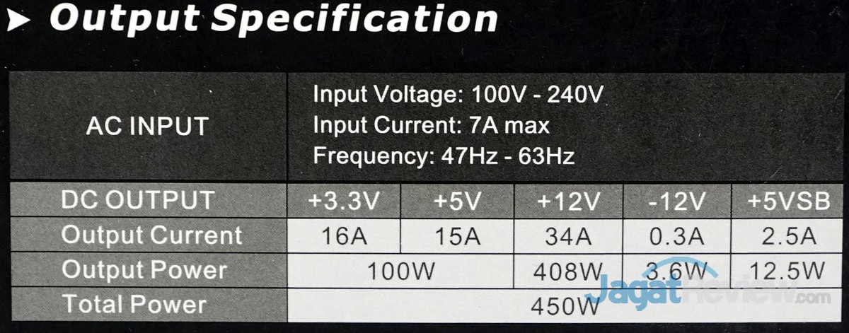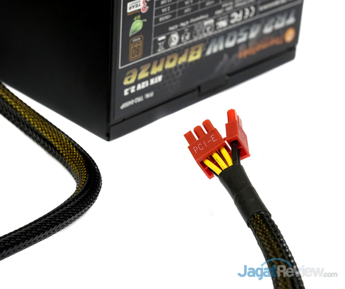 PSU ini juga hanya dilengkapi dengan 1 unit kabel power PCIe 6+2 pin saja. Hal ini merupakan hal yang wajar untuk sebuah PSU berpesifikasi daya yang hanya 450 Watt.