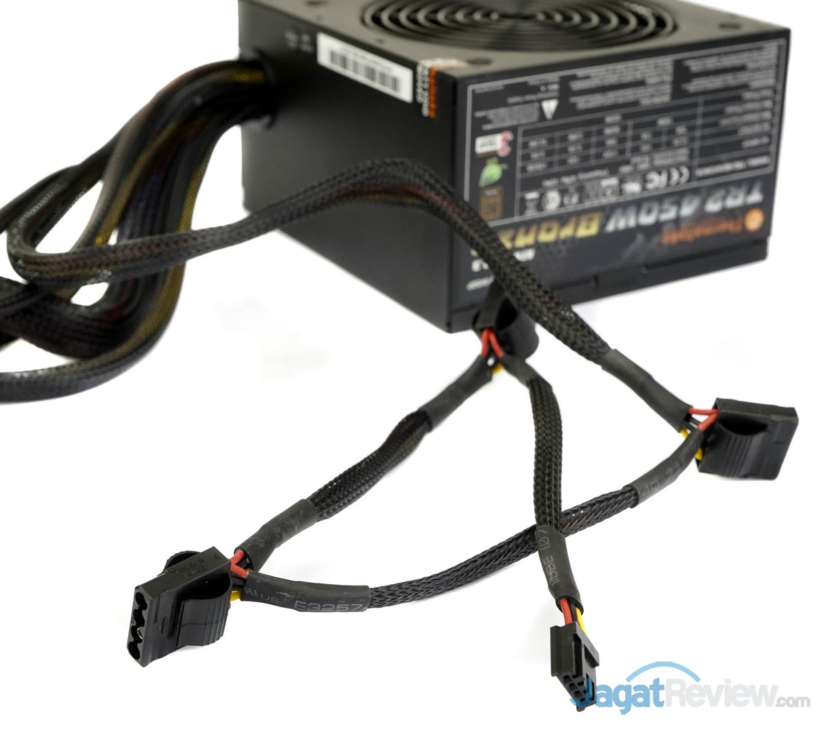 PSU dari Thermaltake ini dilengkapi dengan 2 kabel untuk power SATA yang masing-masing memiliki 4 konektor power SATA.