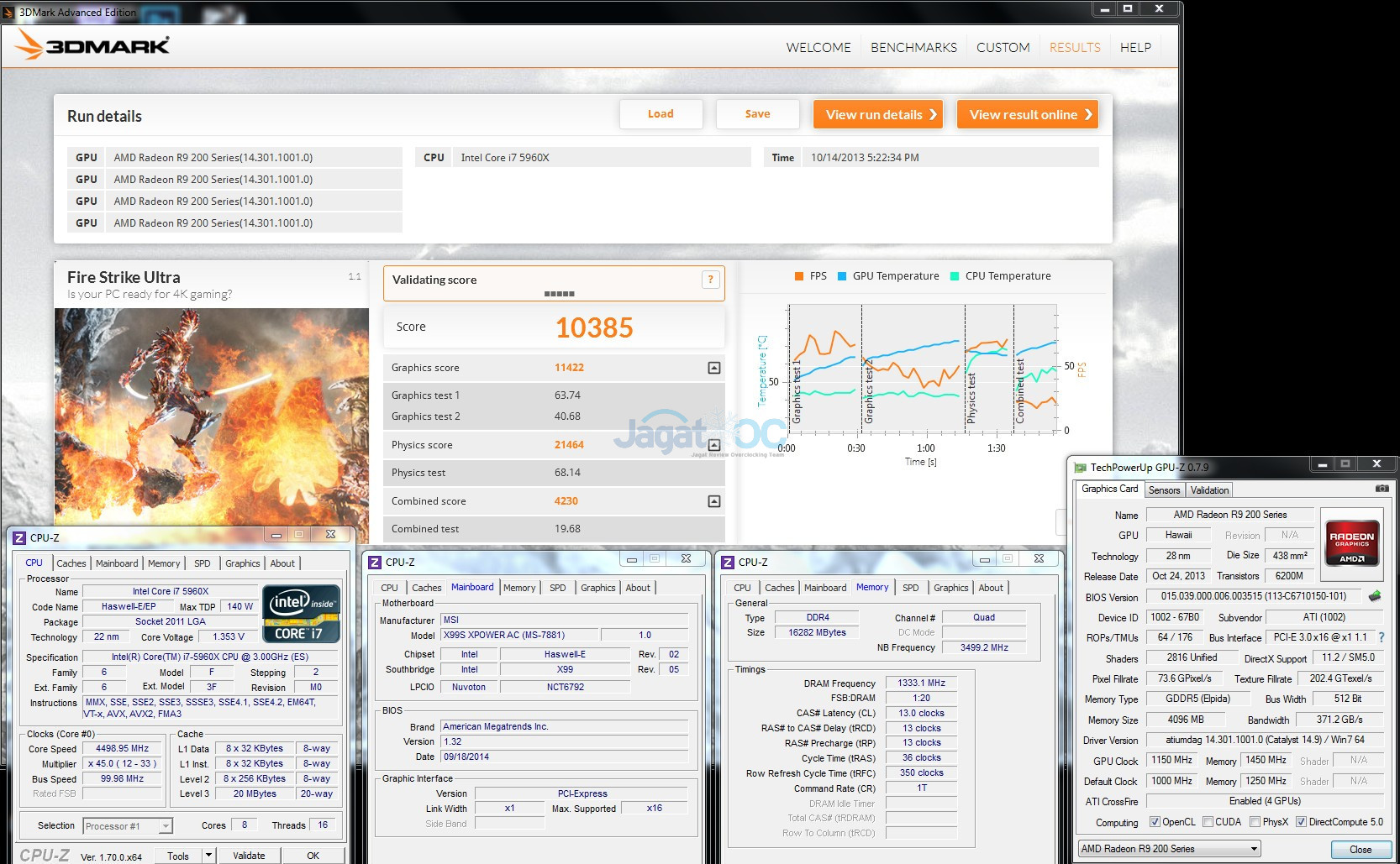Dengan driver sudah di-optimalkan, kami meng-overclock setiap GPU-nya menjadi 1150Mhz (Core Clock) dan 1450Mhz (Memory Clock), dan mendapat skor 10385 seperti yang terlihat dibawah ini: