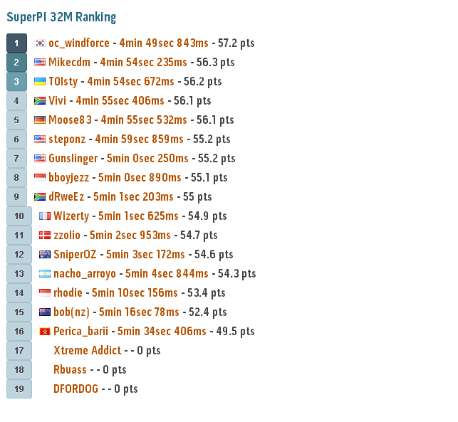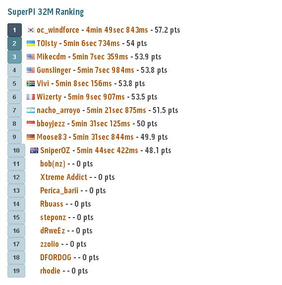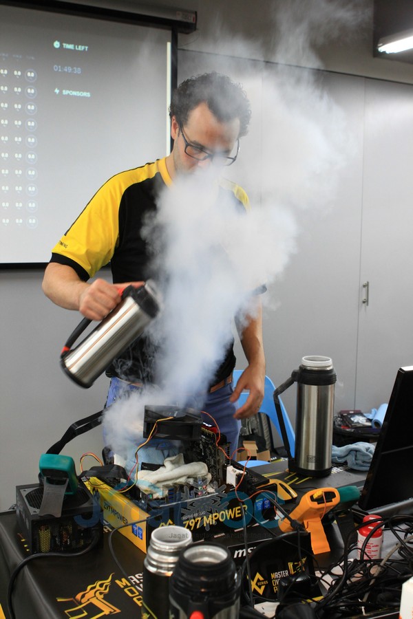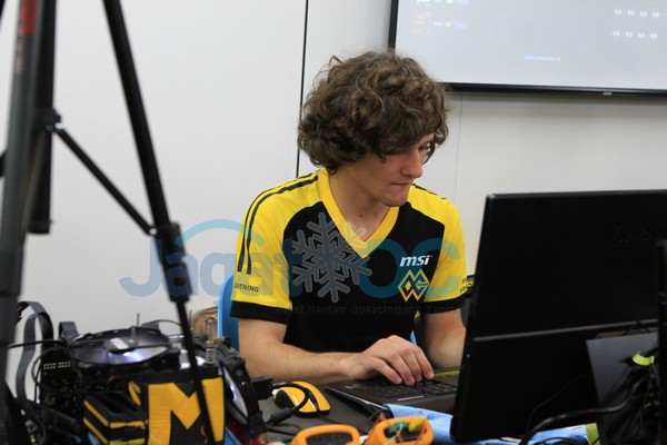 11.00: nacho_arroyo dan bboyjezz melakukan submit super pi 32M, sementara ini nacho_arroyo masih memimpin dengan waktu 5 menit, 21.875 detik dengan prosesor berjalan pada 5,8 GHz!