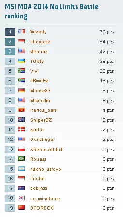 Setelah kurang lebih 6 jam bertanding, akhirnya No Limits Battle berahir. Babak kompetisi kedua dari MSI kali ini dimenangkan oleh wizerty dengan point 70! mencatatkan sekitar 30 hardware record sehingga wizerty bisa memenangkan lomba tersebut. Untuk recap pertandingan kali ini, Anda bisa melihatnya disini. Berikut papan skor terakhir saat lomba berakhir: