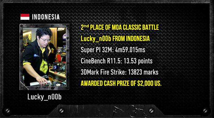 Sebagai contoh, tahun lalu ada seorang overclocker senior Indonesia, Alva “Lucky_N00b” Jonathan , yang mendapat posisi 2 di MSI MOA 2013. Alva harus menerima posisi kedua karena kekalahan tipis dengan persentase 0.2% dari lawannya, padahal dia berhasil menjadi juara di stage nomor 1 dan 2, namun saat di stage 3 yang persentasenya lebih besar dari kedua stage tersebut, dia kurang beruntung sehingga mengharuskan dia untuk bergeser ke posisi dua. Untuk hadiah sendiri di Classic Battle, Juara pertama akan mendapatkan USD $3000!, jumlah yang sangat fantastis. Disusul juara kedua, ketiga, dan keempat dengan hadiah USD $2000, USD$1500, dan USD $1000.
