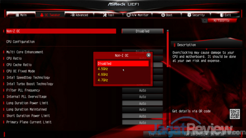 Fitur Non-Z OC inilah yang menjadi daya tarik utama dari motherboard H97 ini. Karena pada H97 konvensional fitur ini tidak dimiliki, dan hanya tersedia pada varian Z97 yang harganya lebih tinggi. BCLK Ratio tidak ditemukan pada motherboard ini, dan penggunanya hanya terbatas untuk mengatur multiplier ratio saja. Kami akan mencoba melakukan OC i7-4790K pada setting 4,7 GHz.