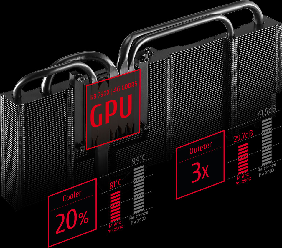 Sistem pendingin DirectCU II pada R9 290X seri ROG MATRIX menggunakan dua buah kipas, di mana salah satunya adalah kipas kreasi terbaru dari ASUS bernama CoolTech Fan. CoolTech Fan terdiri dari dua bagian, yaitu sisi dalam dengan bilah kipas seperti kipas blower dan bagian luar dengan bilah kipas melengkung. Desain kipas seperti ini diklaim mampu menghasilkan performa pendinginan 20% lebih baik dan tingkat kebisingan tiga kali lebih rendah dibandingkan kipas pada sistem pendingin reference. ASUS menggunakan kipas CoolTech Fan untuk mendinginkan area di sekitar chip GPU sedangkan area VRM di sisi ekor graphics card menggunakan kipas dengan desain konvensional. ASUS juga masih menggunakan Direct CU II yang menggunakan lima buah heatpipe. Namun, satu hal yang berbeda, ukuran heatpipe pada graphics card umumnya berkisar 6-8 mm, khusus untuk seri ROG MATRIX, ASUS menggunakan heatpipe berukuran 10 mm agar memiliki distribusi panas lebih baik.