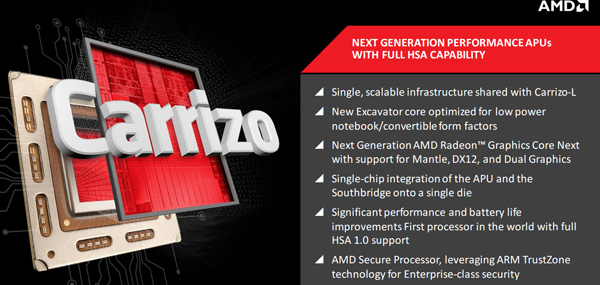 Carrizo adalah sebuah SoC (System on Chip). Jadi, semua komponennya terpadu dalam sebuah chip. Bahkan southbridge pun sudah dimasukkan ke dalam chip tersebut. Jadi, seharusnya notebook yang menggunakan Carrizo akan dapat dibuat cukup tipis dan ringkas.