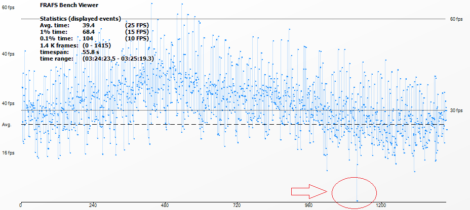 Dari graph di atas juga sudah jelas bahwa AC Unity tidak bisa dijalankan dengan prosesor dengan 2 core dan 2 thread sekelas Pentium G3258. Bukan hanya FPS-nya yang sudah sangat rendah dan tidak nyaman dimainkan, tapi kami sering sekali mengalami kejadian dimana game ‘stuck’ beberapa detik. Anda bisa melihat kejadian tersebut pada FRAFS bench viewer di bawah, dimana ada kejadian framerate drop ke 0 FPS karena game ‘berhenti’ sejenak: