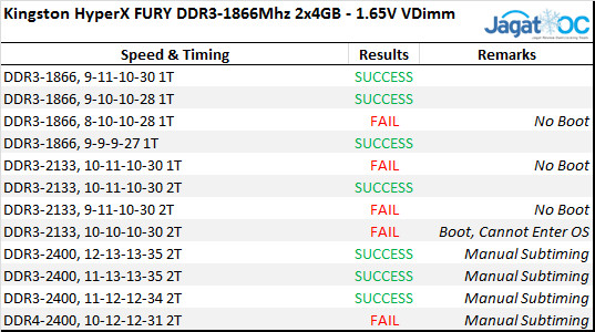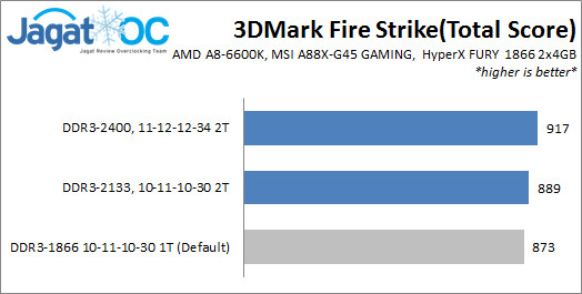 Pada kecepatan DDR3-1866, FURY tidak memiliki masalah saat berjalan pada CAS Latency 9, namun kecepatan DDR3-2133Mhz ke atas harus dicapai dengan CAS Latency 10 atau lebih. Pada sistem APU yang kami jalankan, nampaknya juga kami harus menjalankan Command Rate ke 2T untuk mendapat kestabilan di kecepatan tinggi.