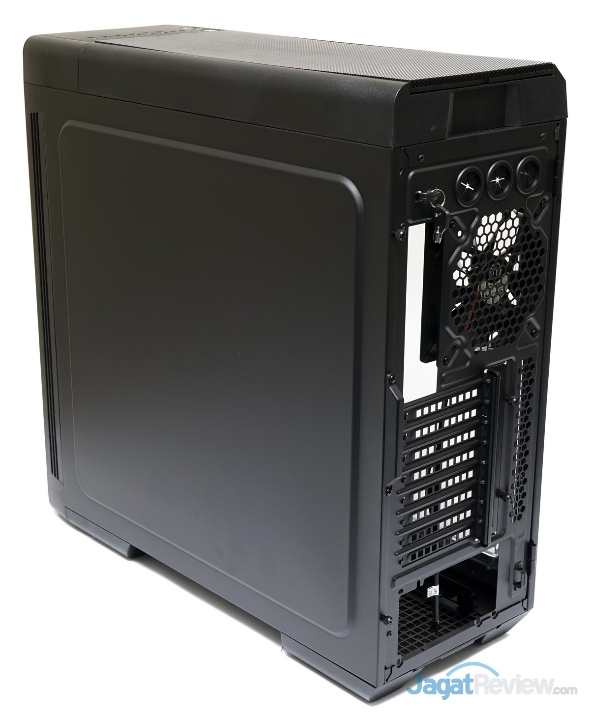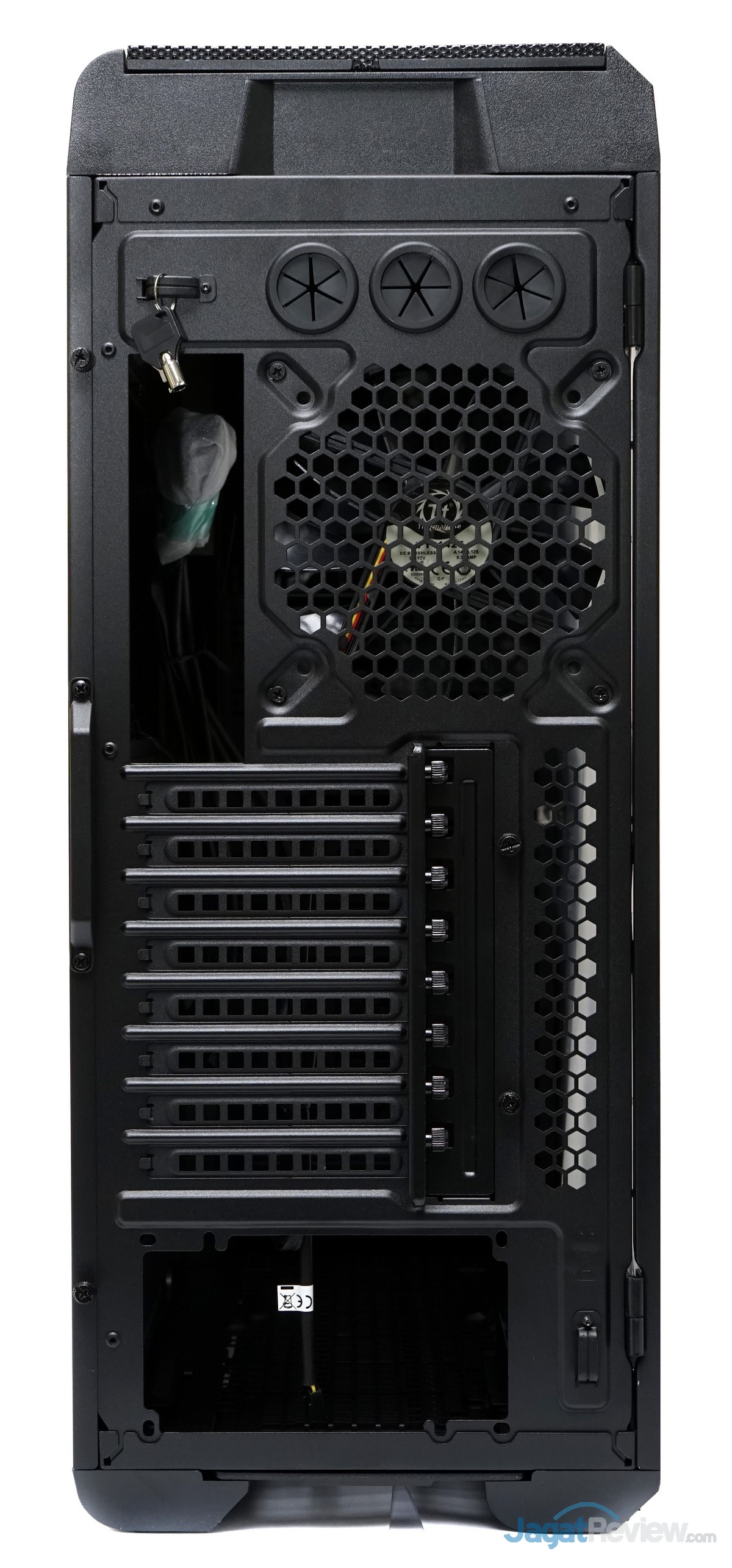 Pada bagian belakang casing Thermaltake ini terdapat sebuah ventilasi udara yang dilengkapi dengan sebuah fan berukuran 140mm. Selain itu, terdapat pula 3 lubang selang untuk custom-watercooling dan casing ini juga memiliki 8 slot PCIe.