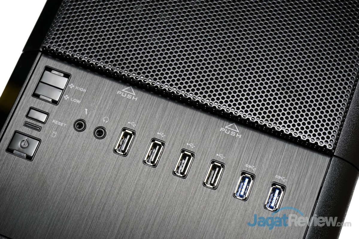 Front panel casing Urban T81 terletak pada bagian atas casing. Terdapat 4 port USB 2.0, 2 port USB  3.0, tombol on/off, tombol reset, tombol pengaturan fan-controller dan port audio i/o di bagian tersebut.