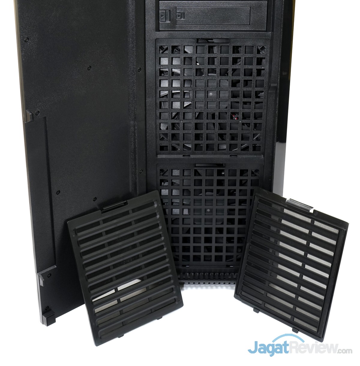 Kedua ventilasi udara pada bagian depan casing ini juga dilengkapi dengan filter penyaring debu yang akan menyaring udara yang ditarik oleh 2 unit fan berukuran 200 mm.