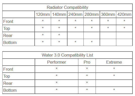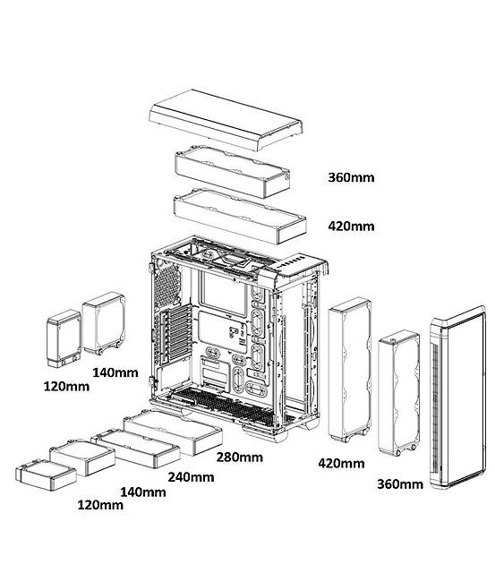 Radiator Support Front: 1 x 120mm or 1 x 240mm or 1 x 360mm 1 x 140mm or 1 x 280mm or 1 x 420mm Top: 1 x 120mm or 1 x 240mm or 1 x 360mm 1 x 140mm or 1 x 280mm or 1 x 420mm Rear: 1 x 120mm or 1 x 140mm Bottom: 1 x 120mm or 1 x 240mm 1 x 140mm or 1 x 280mm