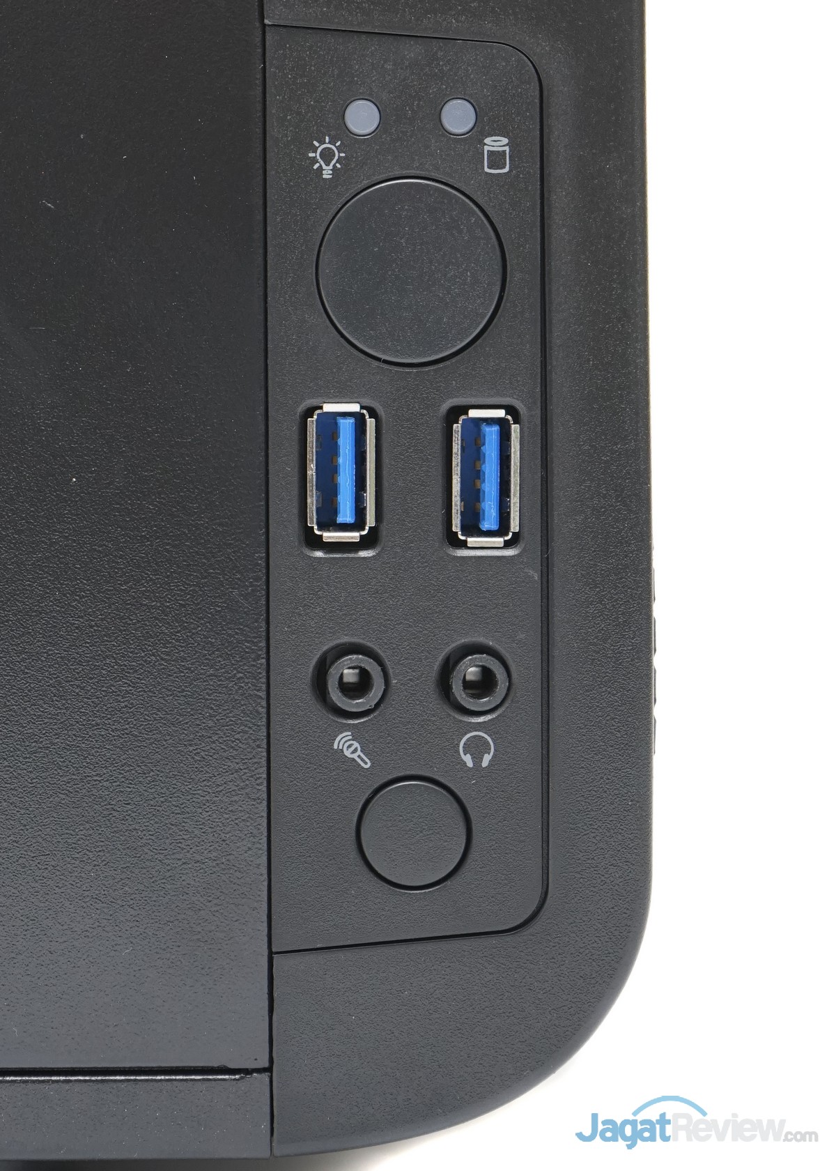 Tombol dan I/O front-panel casing Core V1 ini ditempatkan pada bagian sisi kiri casing ini. Front-panel casing ini dilengkapi dengan 2 port USB 3.0 , port Audio In/Out, Ttmbol ON/OFF, tombol Reset, lampu LED power dan lampu LED HDD.