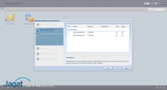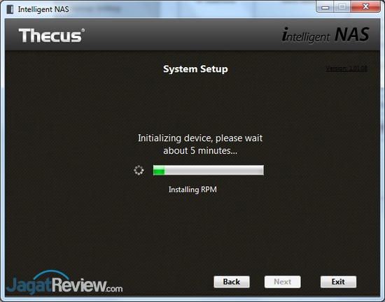 Salah satu fitur yang dikedepankan oleh Thecus dalam N2310 adalah konfigurasi cepat yang diusungnya. Menurut informasi di situs resmi Thecus, N2310 hanya membutuhkan waktu 5 menit untuk setup awal. Kami mencoba membuktikan hal tersebut ketika pertama kali menggunakan NAS ini. Kami mendapati klaim tersebut ada benarnya, terutama bila Anda memanfaatkan aplikasi yang disertakan oleh Thecus untuk konfigurasi awal NAS ini. Sayangnya, opsi konfigurasi yang ada benar-benar terbatas. Kami hanya bisa mengatur kedua harddisk yang terpasang untuk beroperasi dalam mode JBOD atau RAID 1 saja, tanpa ada opsi untuk RAID 0. Pihak Thecus memberikan keterangan bahwa untuk opsi konfigurasi lain, mau tidak mau pengguna harus membuka dashboard dan melakukan konfigurasi secara manual.