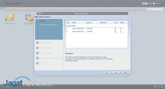 N2310 mendukung penggunaan dua buah harddisk, oleh karena itu, mode operasi storage yang didukungnya adalah RAID 0, RAID 1, dan JBOD. Thecus menampilkan menu konfigurasi RAID di halaman utama dashboard dari perangkat ini sehingga pengguna dapat mengaksesnya dengan mudah untuk membentuk RAID baru atau hal-hal lain. Secara umum, tata cara pengaturan yang tersedia di menu konfigurasi RAID cukup mudah dimengerti dan memudahkan pengguna.