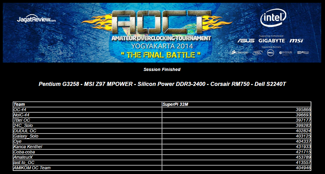 Kami akan coba menceritakan seperti apa serunya adu kemampuan peserta di pagi hingga siang hari ini. Sejak sesi pertama dimulai, langsung terlihat adu skor dari beberapa tim sudah langsung terlihat. Semua peserta berhasil mencatatkan skor di sesi pertama ini, yaitu di benchmark SuperPi 32M. Tetapi, skor dari 3 tim jauh mengungguli lawan-lawannya dan menguasai posisi 3 besar.