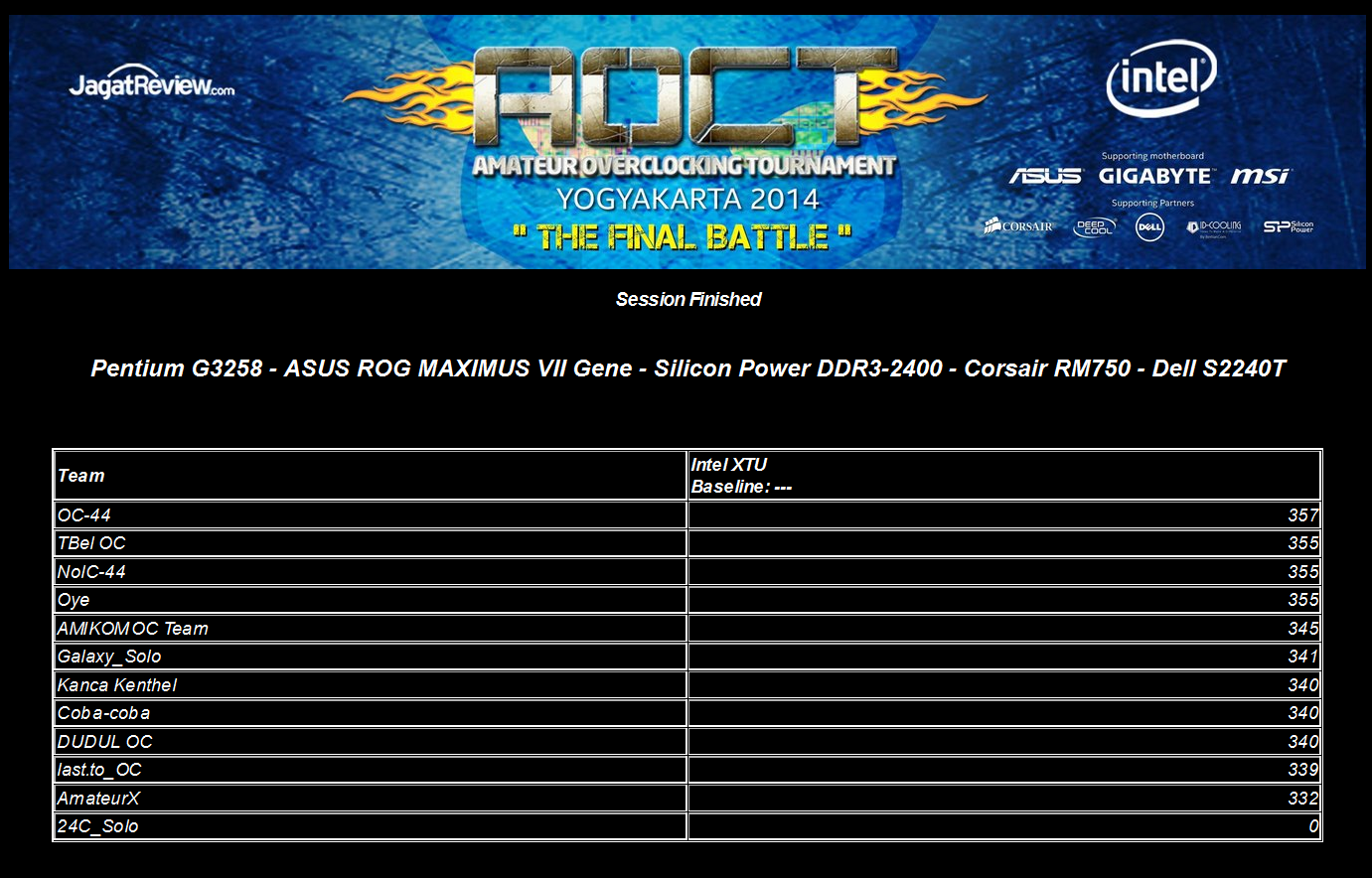 Beralih ke sesi kedua, kali ini peserta harus menghadapi benchmark yang “berbahaya”, yaitu Intel XTU. Sejak awal, adu skor kembali terjadi antara tiga tim yang menguasai sesi sebelumnya. Baru di akhir sesi, terdapat satu tim lagi yang berhasil mendekati perolehan skor dari ketiga tim yang menjadi jawara di sesi sebelumnya.
