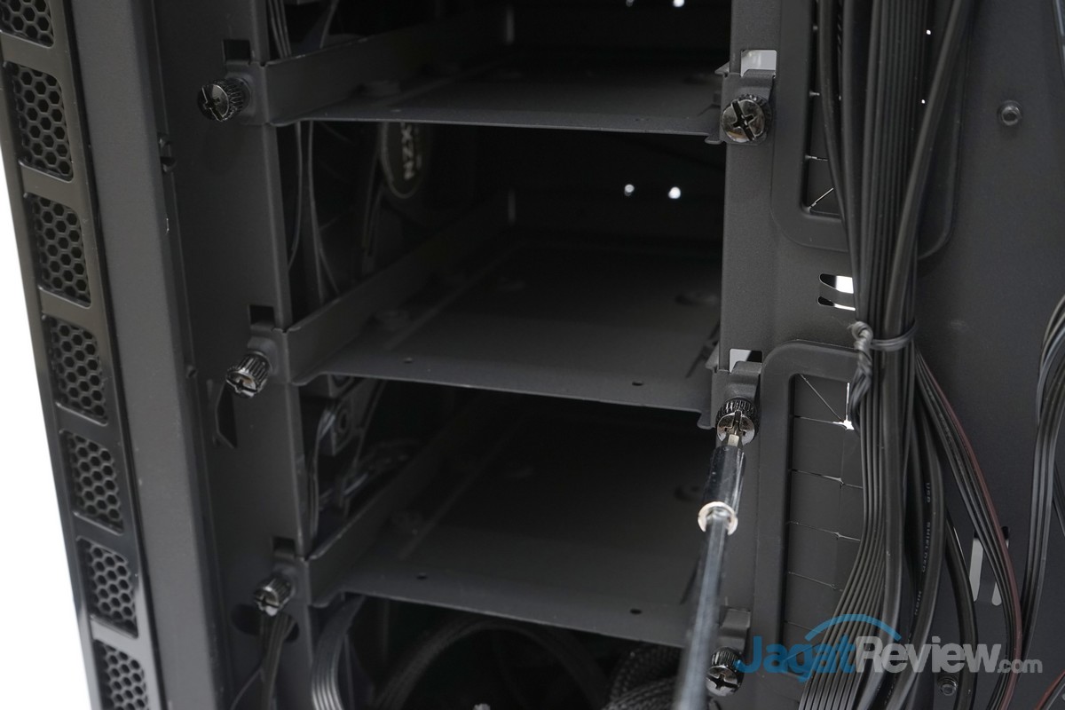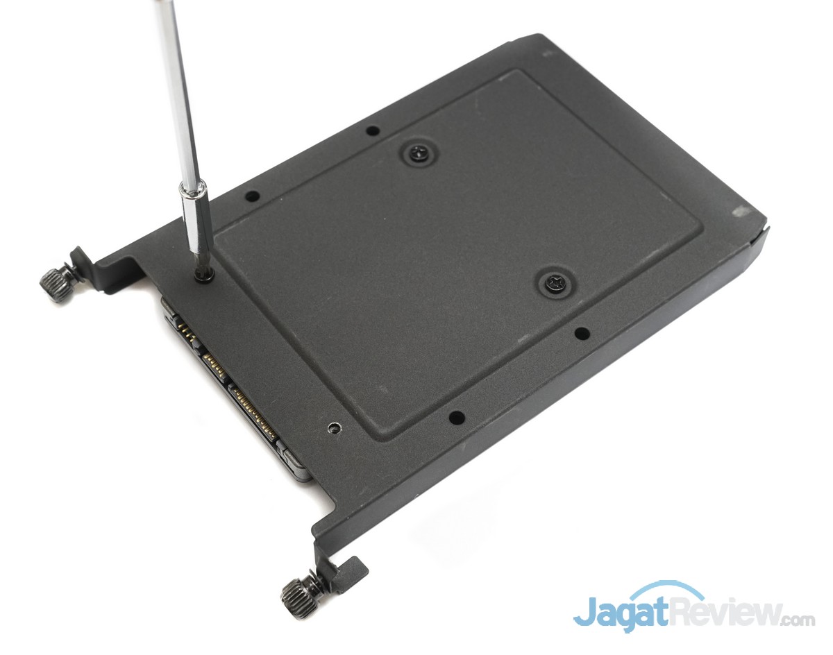 Pada pemasangan harddisk dan SSD, kami dapat dengan mudah memasang harddisk dan SSD pada bracket storage milik casing NZXT H440 Razer Edition ini. Hanya saja, cukup disayangkan mekanisme pengunci storage yang ada pada casing ini tidak dilengkapi dengan sistem screwless.