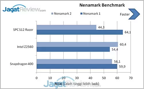 Nenamark adalah benchmark untuk OpenGL ES 2.0. Benchmark ini menampilkan efek grafis yang akan memaksa GPU (Graphic Processor Unit) bekerja secara maksimal. Semakin tinggi nilai yang didapat, semakin bagus.