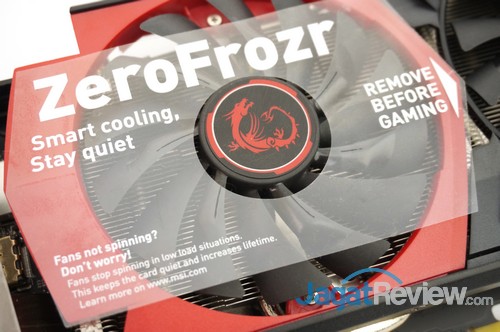 Sebelum membahas lebih lanjut, masih ingat stiker ini?! Yup, stiker yang sama digunakan di produk GeForce GTX 980 dan GeForce GTX 970 milik MSI tersebut memberi sebuah info menarik bagi penggunanya. Stiker tersebut menandakan bahwa graphics card tersebut menggunakan teknologi ZeroFrozr dimana kipas dari sistem pendingin Twin Frozr V hanya akan berputar pada suhu dibawah 60 °C. Alhasil saat load graphics card hanya menghasilkan suhu di bawah itu, MSI GTX 960 Gaming OC tidak menghasilkan kebisingan sedikit pun. Hal tersebut tentu membuat Anda lebih nyaman. So, fans not spinning? Don’t worry!