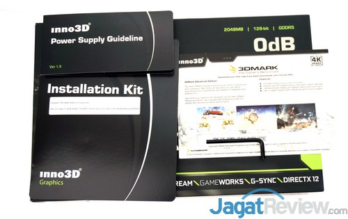Terkait dengan perlengkapan, beberapa tambahan unik kami temukan di paket penjualan graphics card ini, seperti lembar panduan pemilihan power supply. Selain lembar tersebut, Inno 3D juga menyertakan buku manual dan kunci untuk membuka baut dari pendingin Inno 3D GTX 960 OC. Terdapat juga satu kupon 3DMark di dalam paket penjualan!