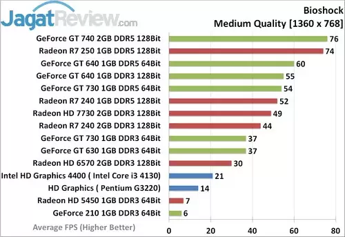 Dalam pengujian Bioshock Infinite, dengan menggunakan setting medium untuk kualitas tampilan yang baik, empat peserta gagal memberikan pengalaman bermain yang baik. Walaupun begitu, performanya masih belum cukup untuk mendapatkan framerate rata-rata 30 FPS untuk menjalankan game ini dengan nyaman. Graphics card lain sudah bisa menangani game ini di rata-rata 30 FPS ke atas seperti R7 250 dan GT 740 dengan FPS yang cukup tinggi pada 1360×768, yaitu 76 FPS dan 74 FPS.