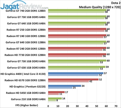 Di pengujian Dota 2, terlihat ada dua graphcis card yang gagal memberikan pengalaman yang baik untuk bermain DOTA 2, yaitu HD 5450 dan juga GT 210. Selain itu, HD Graphics di Pentium G3220 juga kesulitan menjalankan game tersebut di tingkat yang nyaman. HD 6570 sendiri mencatatkan skor 42 FPS, kurang 3FPS dari yang kami sarankan. Graphics card lain, dan juga IGP Core i3-4130, mampu memberikan pengalaman bermain DOTA 2 yang baik, yaitu minimum FPS berada pada 45 poin.