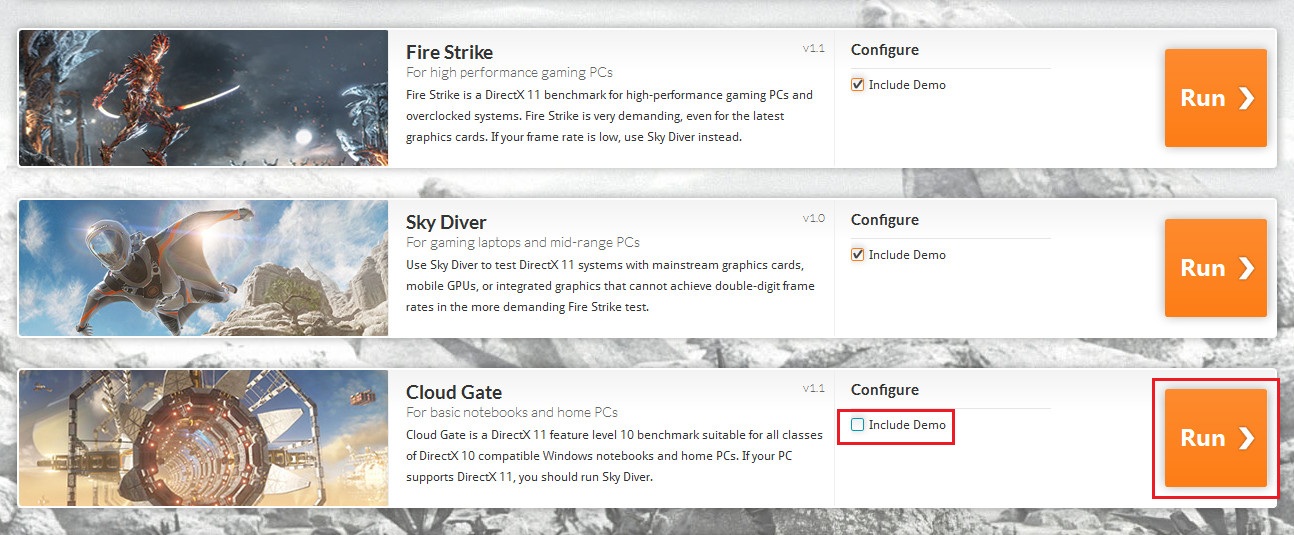 Pada benchmark 3DMark yang baru, ada berbagai pengujian yang bisa anda jalankan. Mulai Dari benchmark 3DMark Ice Storm, 3DMark Cloud Gate, 3DMark Sky Diver, dan 3DMark Fire Strike. Sesuai dengan API terendah pada GTA V yakni DirectX 10, kami akan memfokuskan semua pengujian grafis pada 3DMark Cloud Gate yang mensimulasikan pengujian kartu grafis dengan API DirectX 10. Untuk menjalankan benchmark 3DMark Cloud Gate, anda cukup perlu meng-klik ‘Run’ pada menu yang tersedia, jangan lupa menghilangkan tanda centang pada ‘include demo’ supaya anda tidak perlu menjalankan Demo.