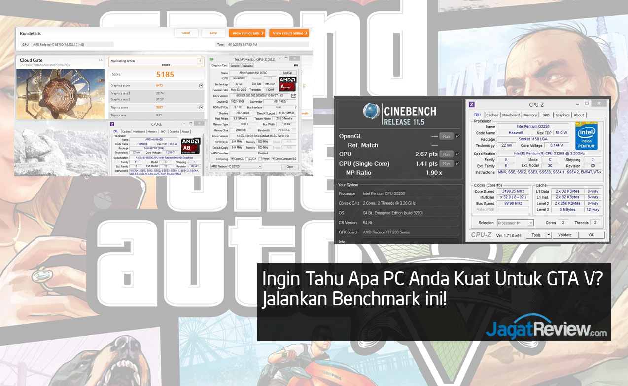 Pertanyaan “Can it run GTA V?” sudah kami temui puluhan kali sejak dirilisnya game PC terhangat saat ini, Grand Theft Auto(GTA) V, beberapa hari lalu. Mengingat kebutuhan spesifikasi minimumnya yang tergolong rendah untuk tahun 2015, para gamer PC berbondong-bondong mencari tahu apakah PC kesayangannya bisa menjalankan game GTA V. Sejauh ini, kami dari JagatReview sudah merilis 2(dua) pengujian performa untuk GTA V, yakni: