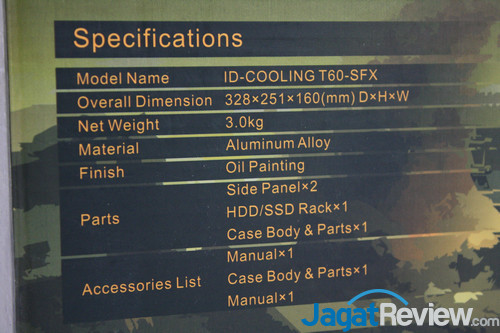 Datang dengan sebuah boks bertema ‘militer’, Perlengkapan yang menyertai casing ID-Cooling T60-SFX adalah sepaket baut ,sekrup dan sebuah manual(tidak terlihat pada gambar). Casing ID-COoling T60 SFX-nya sendiri terbungkus sebuah busa untuk pelindung.
