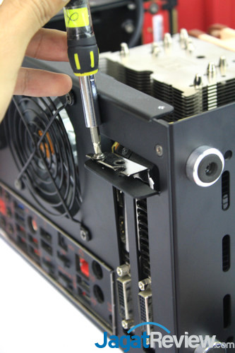 Berikutnya kami memasang kartu grafis Palit GTX 750Ti StormX-Dual ke case ID-Cooling T60 SFX. Pada awalnya kami mengalami kesulitan karena braket VGAnya tidak masuk ke bagian mouting VGA dengan pas. Kami harus sedikit ‘menekan’ VGA ini untuk bisa memasang sekrup penguncinya: