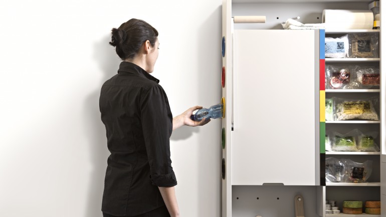 Selain menghadirkan meja pintar, konsep dapur tersebut juga menghadirkan unit penyimpanan yang akan menggantikan posisi lemari es dan rak. Hal ini untuk membuat praktis karena asumsi belanja di masa depan sudah semakin cepat dan bisa dilakukan dengan memesan dan pesanan bisa diantarkan oleh semacam drone. Konsep unit penyimpanan ini menggunakan rak terbuka dengan susunan papan seperti pada kios. Papan rak tersebut dilengkapi dengan sensor tersembunyi dan teknologi induksi pendinginan cerdas sehingga bisa menggantikan fungsi lemari es. Selain tempat penyimpanan untuk mendinginkan bahan makanan, disediakan juga tempat penyimpanan dengan fungsi sebaliknya, yakni untuk memanaskan makanan.