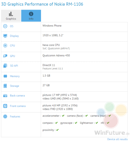 Yang terbaru, info yang tertera di GFXBench mengindikasikan bahwa Lumia selanjutnya menggunakan layar berukuran 5,2 inci dengan resolusi Full HD 1080p. Menurut laporan dari PhoneArena, satu hal yang cukup menarik perhatian adalah perangkat dengan nama sandi RM-1106 ini dibekali Qualcomm Snapdragon 808!