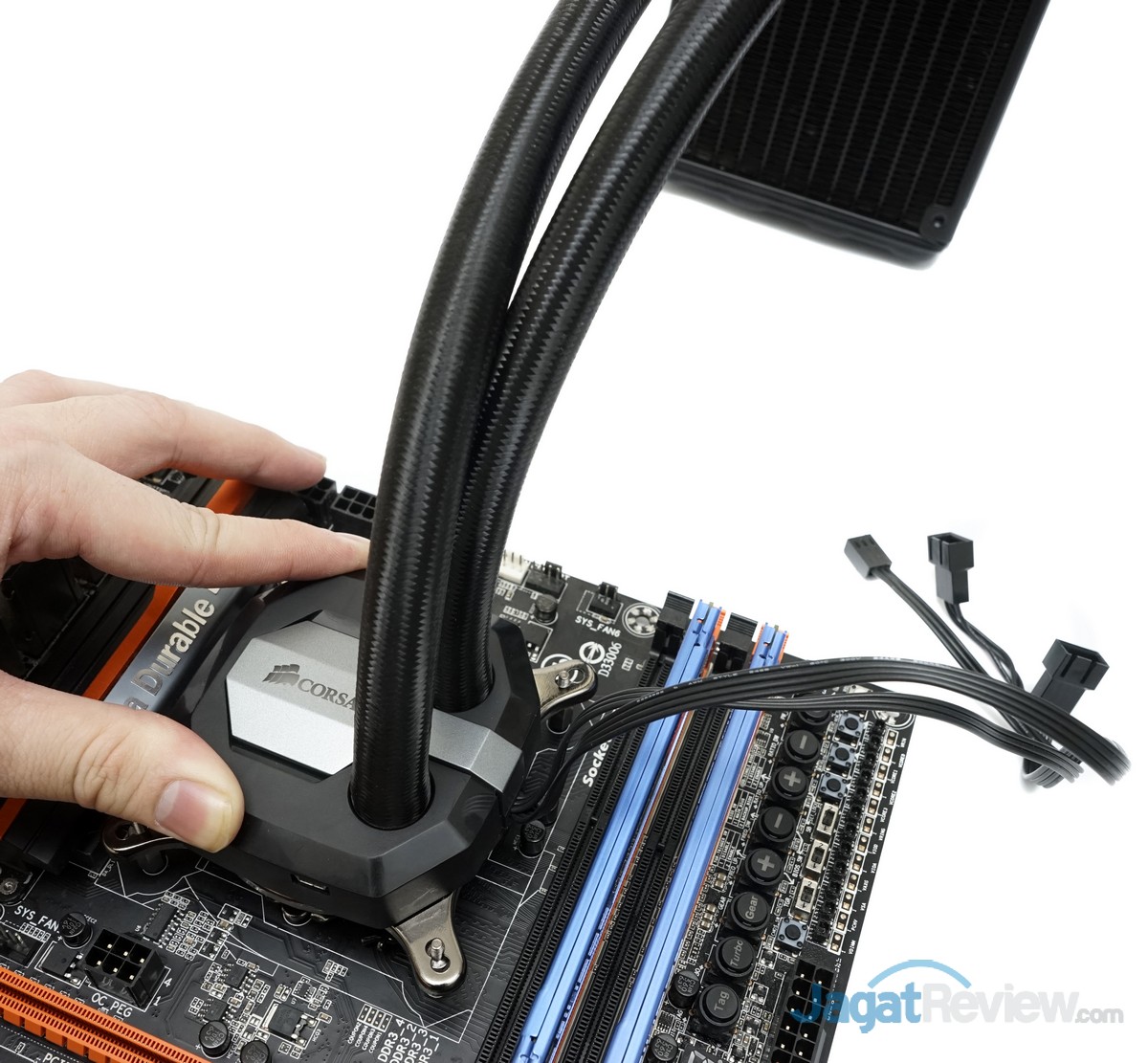 Setelah membereskan pemasangan waterblock, jangan lupa untuk memasang kabel power dari waterblock untuk pompa dan kabel untuk kipas. Agar pompa dapat berkerja dengan baik, disarankan untuk menggunakan konektor 3-pin motherboard yang tidak dilengkapi dengan fitur PWM atau bisa saja menggunakan konektor 4-pin yang memiliki fitur PWM yang sudah diatur untuk berkerja dengan konfigurasi maksimum.