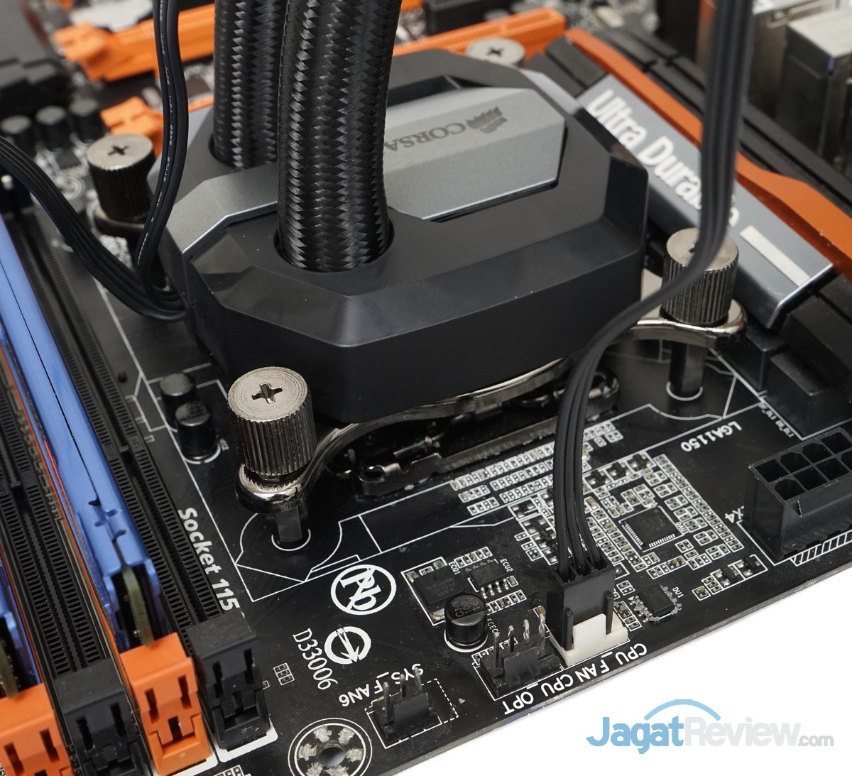 Watercooling Corsair H80i GT yang telah terakit pada motherboard pengujian dan siap dipasang ke dalam casing pengujian.