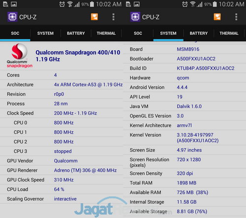 Soal performa, Galaxy A5 berbekal SoC Qualcomm Snapdragon 410 dengan prosesor quad-core Cortex-A53 berkecepatan 1.2Ghz dan GPU Adreno 306. Selain itu, smartphone yang dibanderol Rp 4 jutaan ini didukung RAM 2GB, memori internal 16GB lengkap dengan slot microSD, kamera utama 13 megapixel, kamera depan 5 megapixel, dan baterai 2300mAh (non-removable). Samsung mempercayakan sistem operasi pada Android 4.4.4 KitKat.